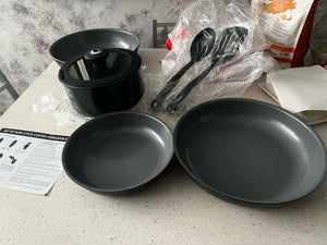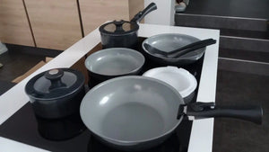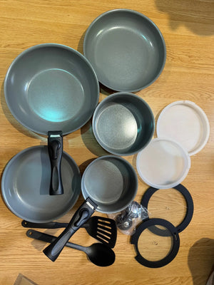 2 saucepans (1.5 and 2.1 quarts), 2 frying pans (8 and 10 inches), 1 saute pan(10 inch), 2 removable handles, 2 cooking utensils, 2 silicone lids, 2 sealing lids for easy storage or refrigerator storage.